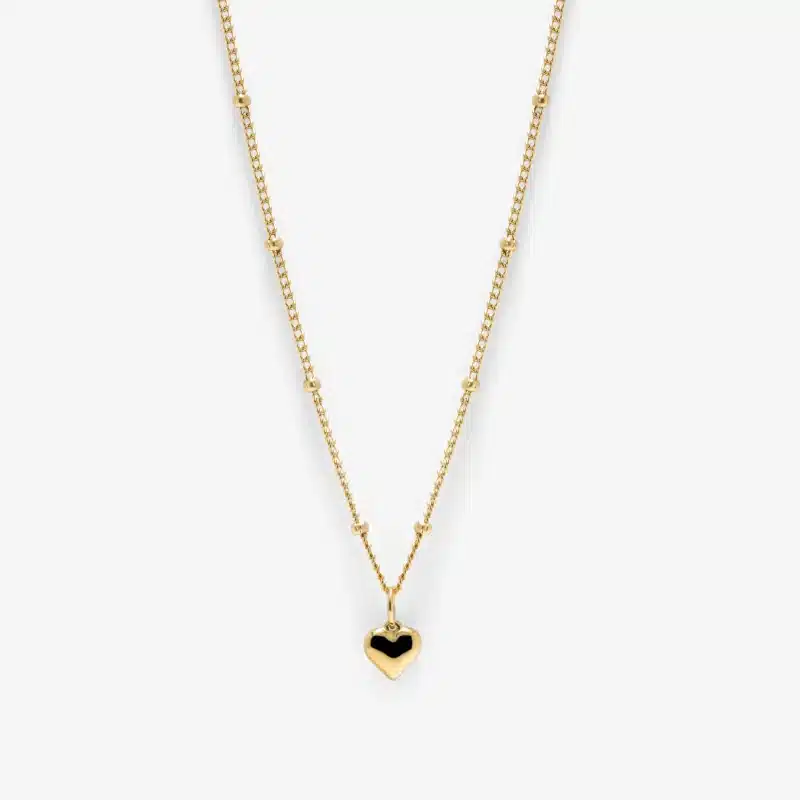 The satellite bead chain adds subtle texture, while the chubby heart charm introduces a smooth, sculptural focal point. Its rounded form and polished finish give the necklace a considered presence without feeling heavy or overstated.