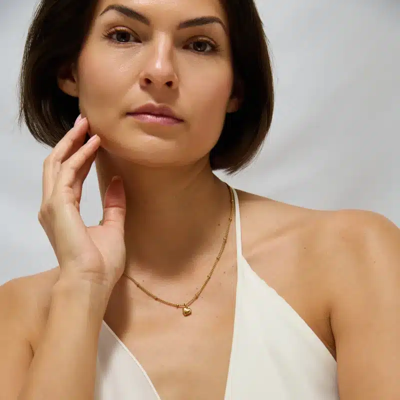 The Chubby Heart Necklace pairs our softly rounded heart charm with a fine satellite bead chain for a balanced, modern look. Designed to sit comfortably at the collarbone, it can be worn alone or layered with other necklaces.