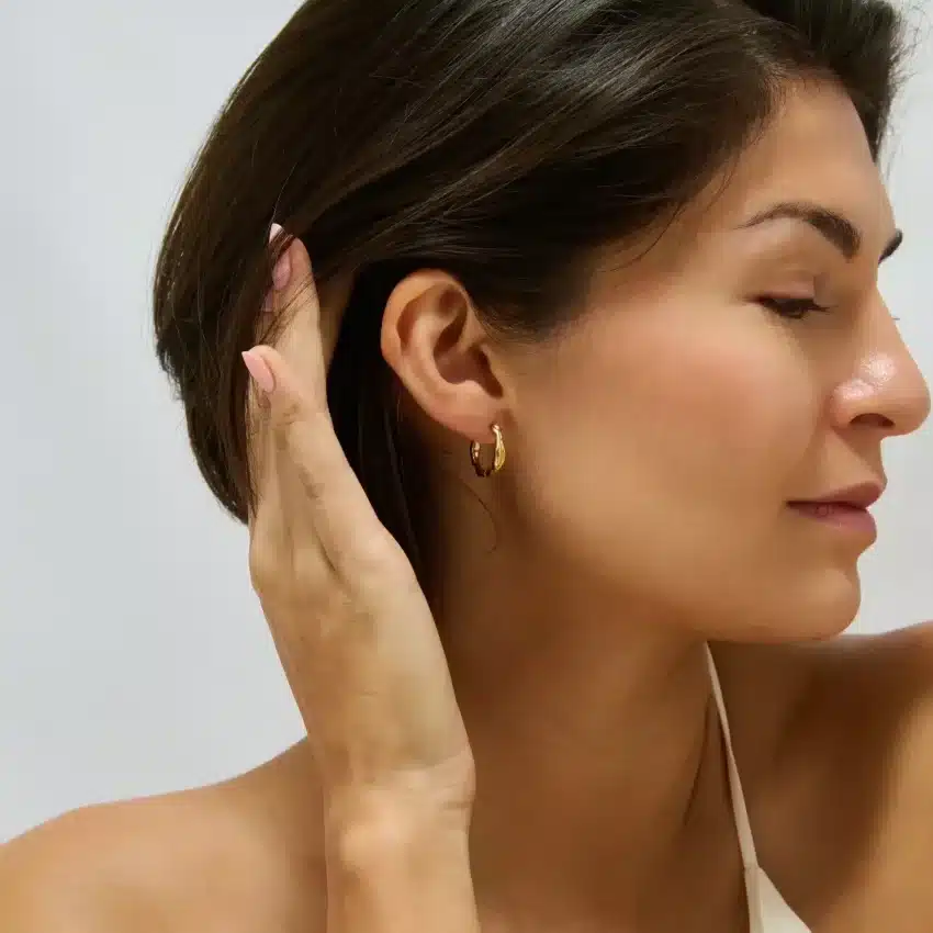 Crafted from recycled stainless steel and coated in 14k gold PVD, they’re lightweight, water-resistant, and built for all-day comfort.
