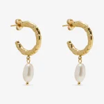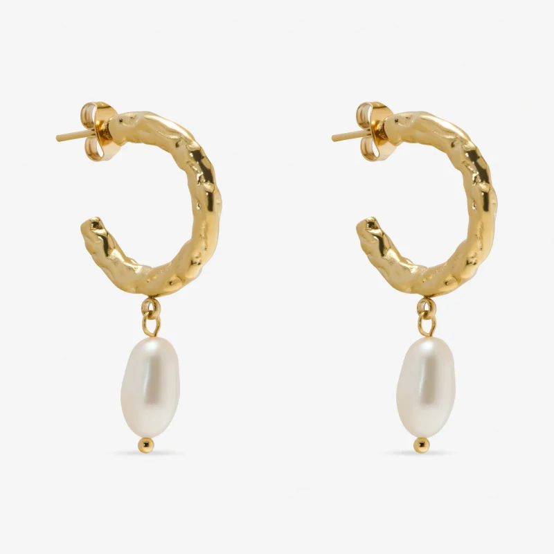 Our Molton Baroque Pearl Hoops are hoop earrings with a natural freshwater baroque pearl drop. Each earring features a freeform hoop with a single pearl suspended below, giving an organic look. They are designed to be worn through pierced ears and sit on the lobe, so the pearl drop hangs just beneath the ear for a gentle movement. The mix of molten texture and pearls makes these earrings versatile enough for everyday wear or special occasions.