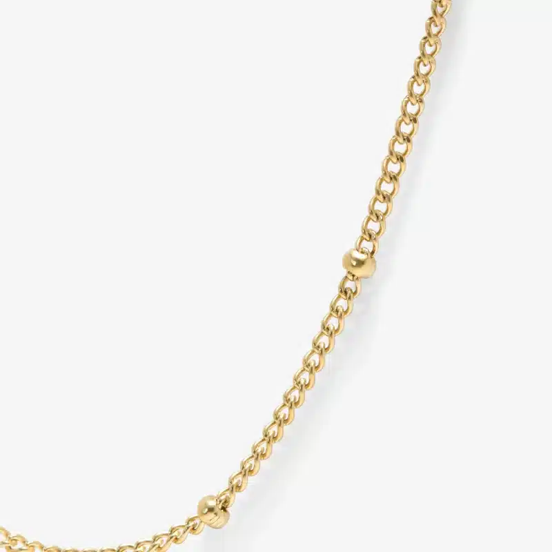 The Satellite Bead Chain is made from recycled stainless steel and finished with 14k gold PVD plating.